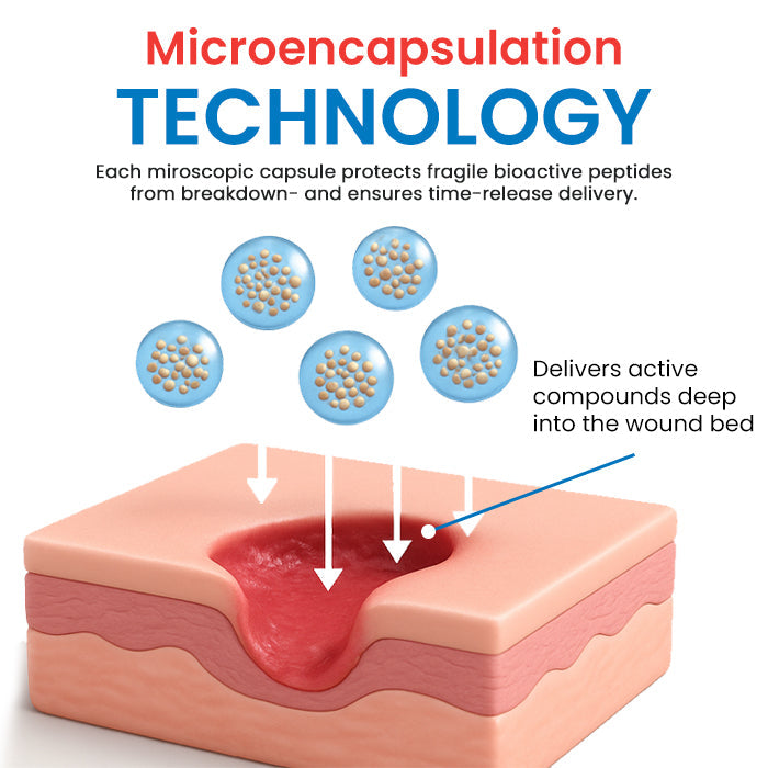 Unlike traditional creams that lose potency on the skinâs surface, DiabeHeal⢠uses advanced Microencapsulation Technology to deliver active compounds deep into the wound bed. Each microscopic capsule protects fragile bioactive peptides from breakdown and ensures time-release deliveryâso your skin receives a consistent dose of healing agents throughout the day. This technology mimics hospital-grade wound-care protocols, promoting faster closure, stronger skin regeneration, and lower recurrence rates.