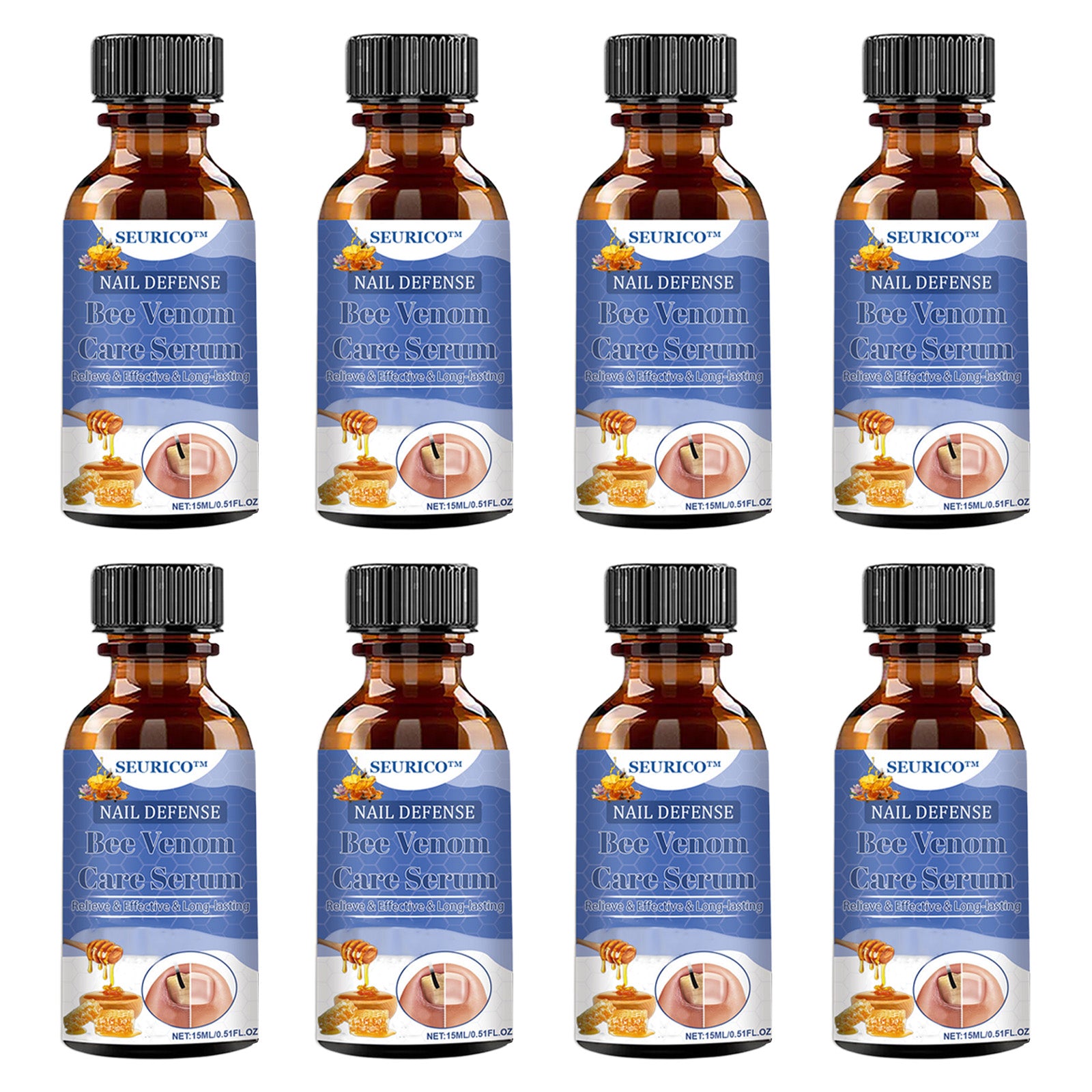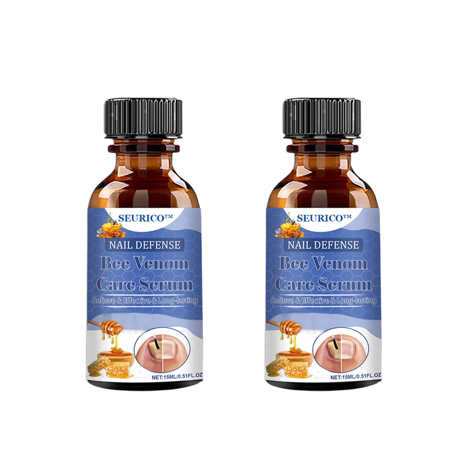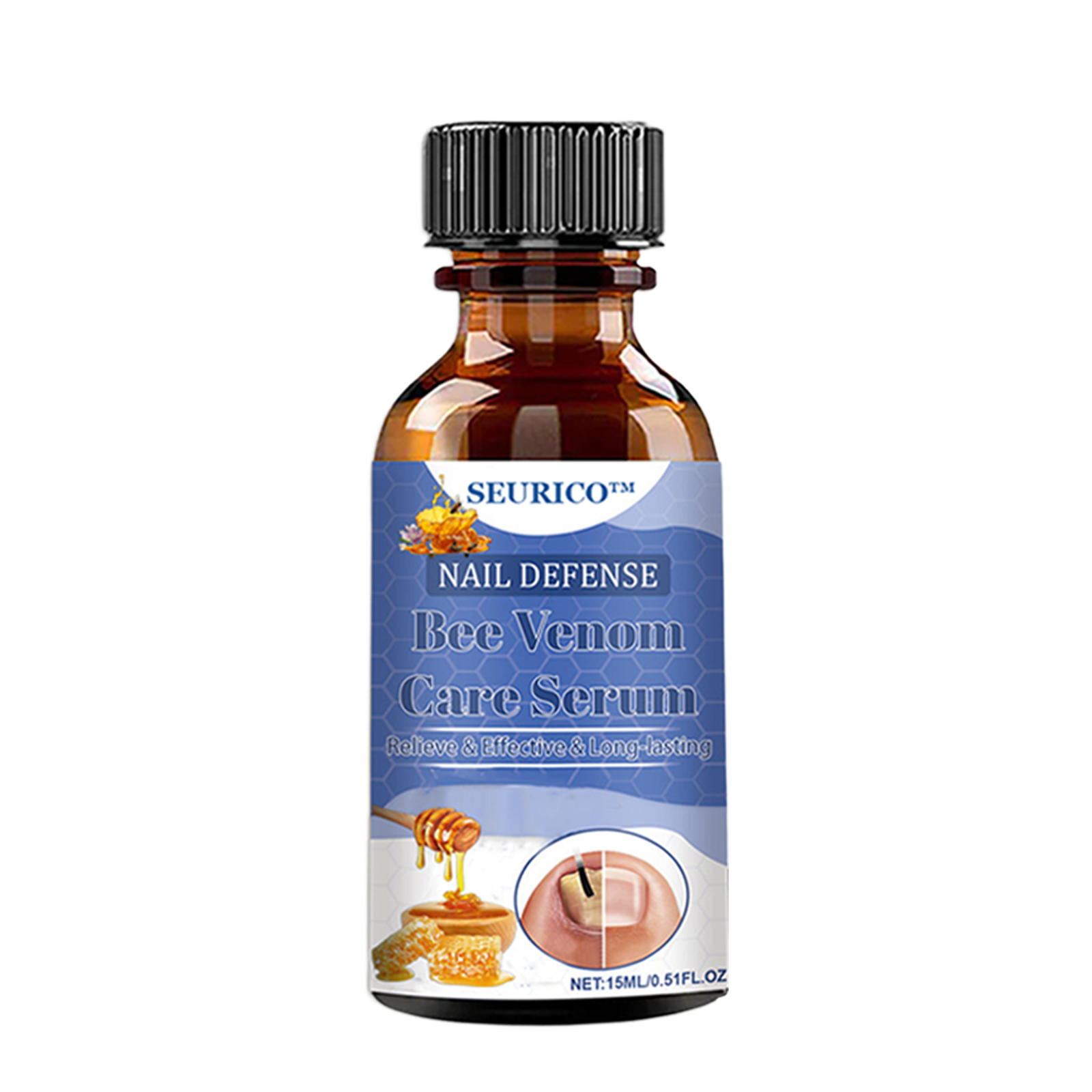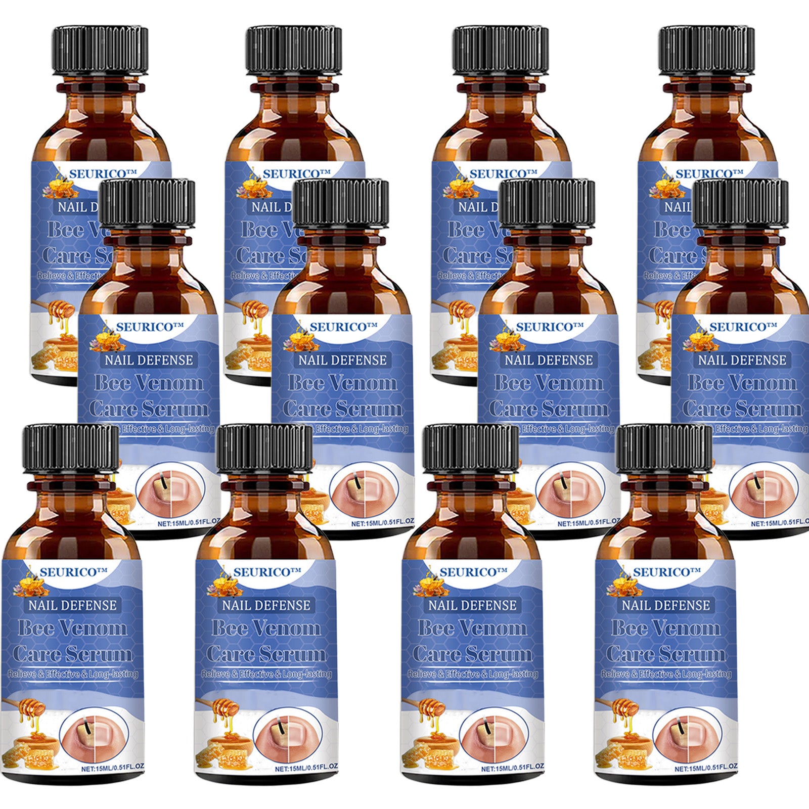 SEURICO™ Bee Venom Deep Repair Nail Essence is a professional nail care solution that complies with FDA standards and is manufactured in GMP-certified facilities in the U.S. Specifically designed to address stubborn nail problems, it combines natural bee venom with a blend of plant extracts to effectively eliminate fungus, fight bacteria, and deeply repair damaged nails, promoting healthy nail growth.